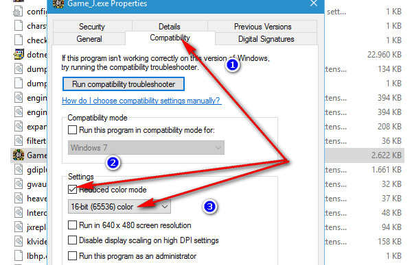 Bước 2: Tại Tab Compatibility tích chọn Reduced color mode và chọn chế độ 16 bit màu.